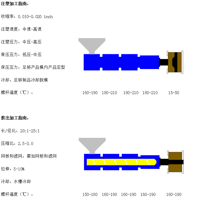 B:建议加工该材料之前、之后,用聚丙烯或聚乙烯清洗螺杆或模头。