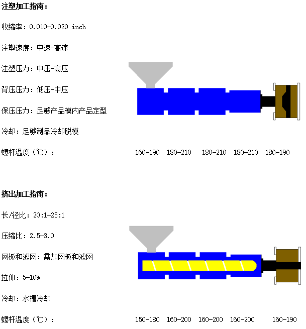 B:建议加工该材料之前、之后,用专用清机料清洗螺杆或模头。