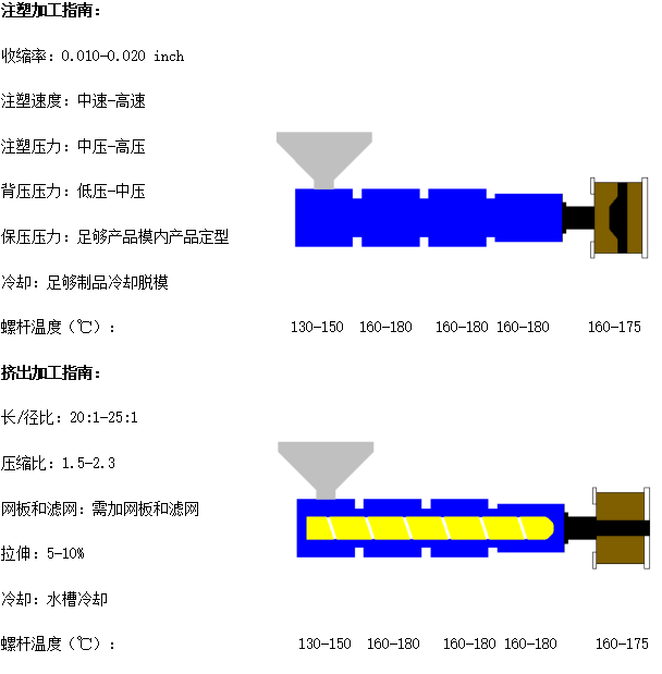 B:建议加工该材料之前、之后,用专用清机料洗螺杆和模头。