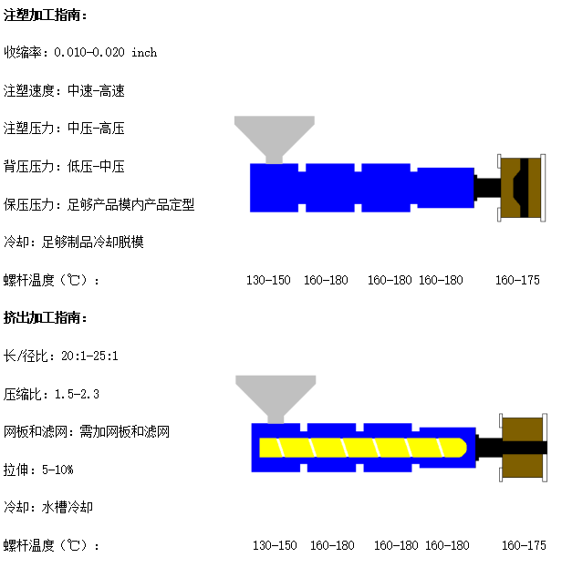 B:建议加工该材料之前、之后,用专用清机料洗螺杆和模头。