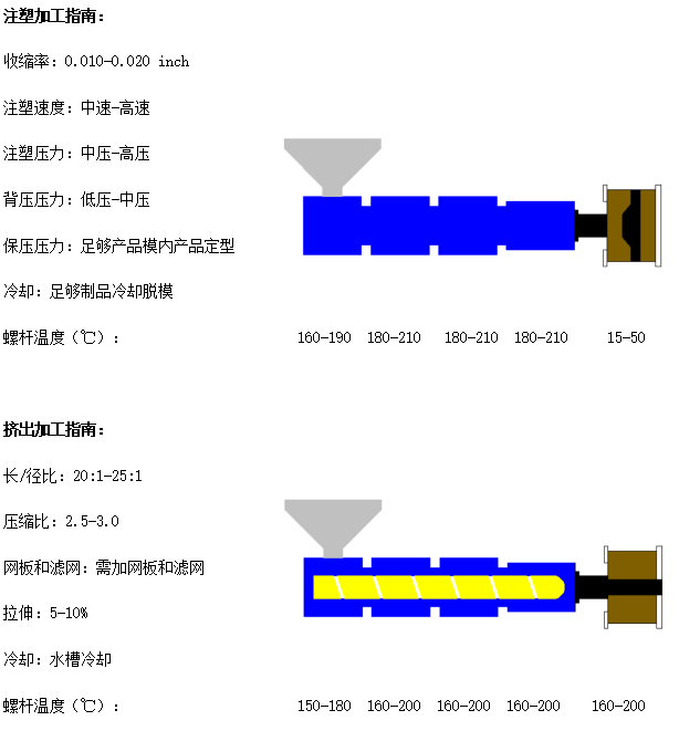 B:建议加工该材料之前、之后,用专用清机料清洗螺杆或模头。